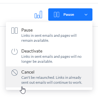 Canceling the journey will stop sending out the new emails but if currently something is still being processed, best effort is made to ensure these will not be delivered to the inbox of the recipients. Also, all links in already sent out emails will continue to work. The status of the journey will be available from the status bar at the top.