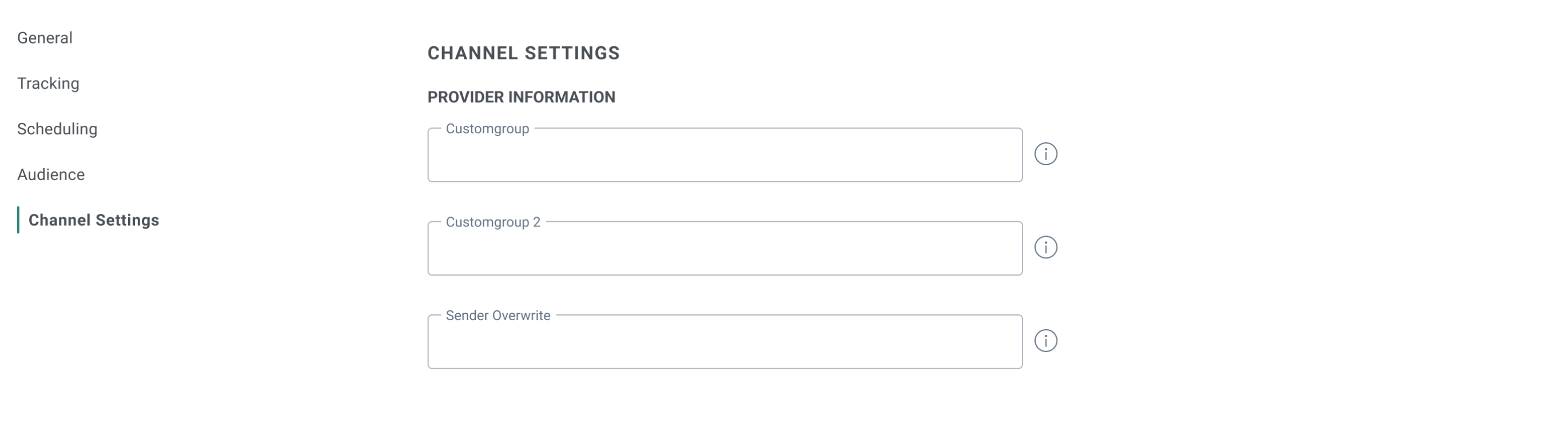 - Channel settings — Custom input fields for SMS, MMS, RCS.