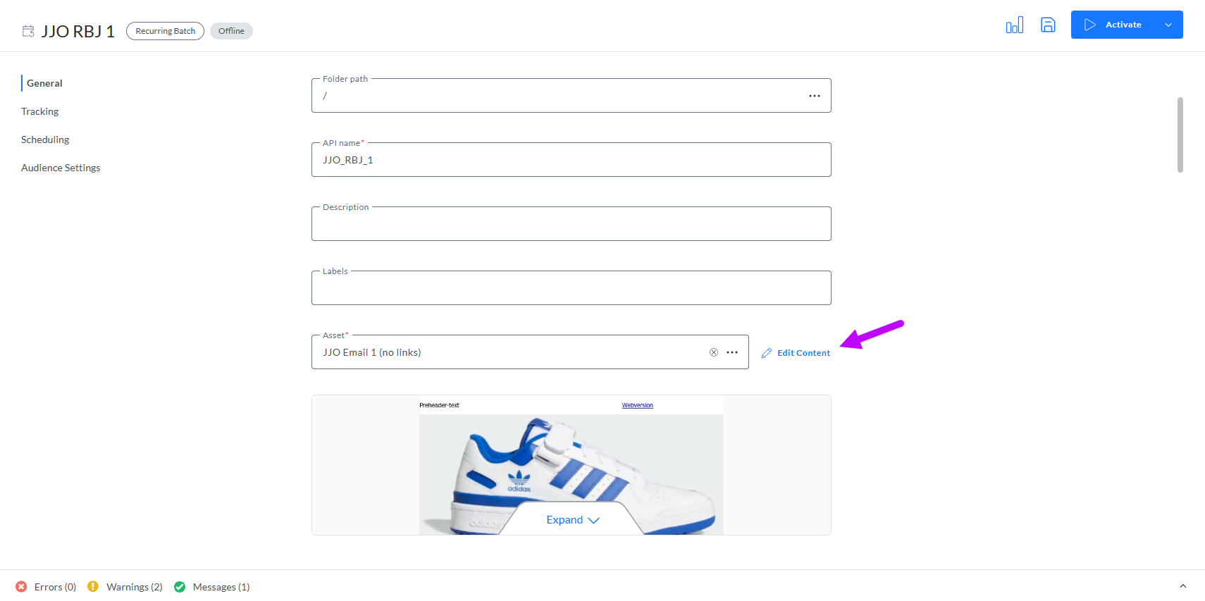 While a journey is paused or deactivated, it's possible to edit the content through the journey by clicking on Edit content next to the selected asset.