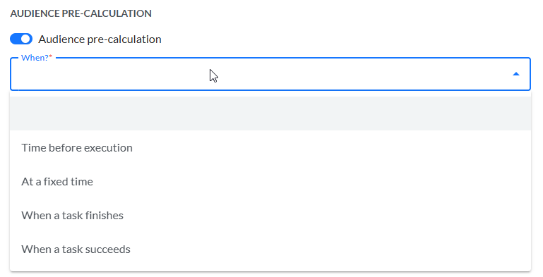 - When — Only displayed when the audience pre-calculation is activated. You can choose from following options: