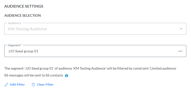 When that message is used in a journey, the defined audience is displayed and the number of contacts in the current selected audience is calculated. This audience itself cannot be edited but you can define a segment here.