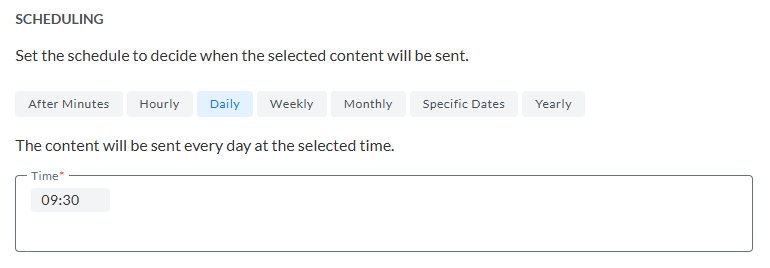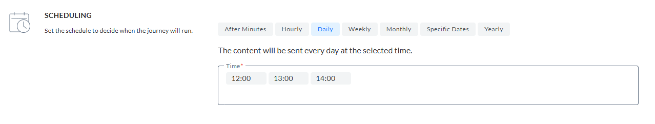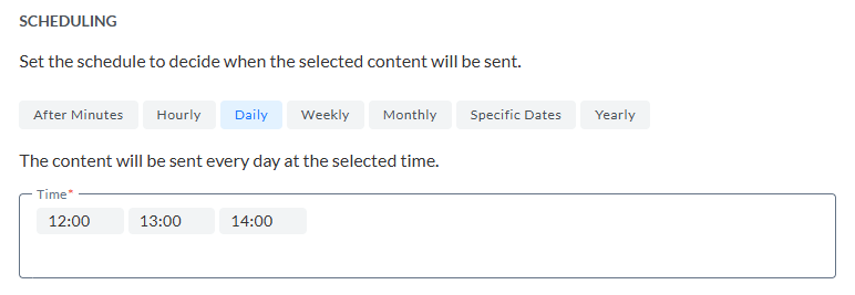 Daily — Send at a given time in the day (e.g., Every day at 12 PM, 1 PM and 2 PM).
