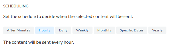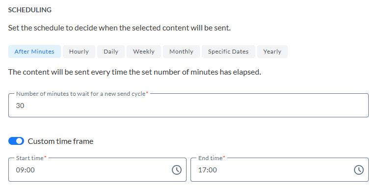 After Minutes — The message is sent every time the set number of minutes has elapsed. Use the Custom time frame option to define the start and end time in between which this rule needs to be executed. For example, send the message every 30 minutes between 9 AM and 5 PM.