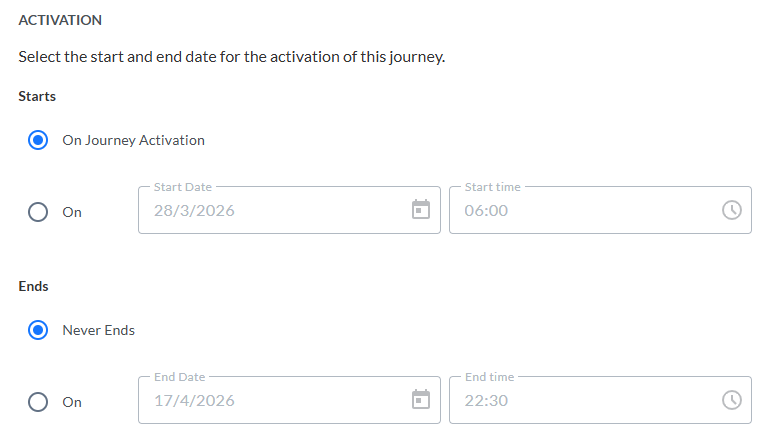 - If the end date/time is omitted, the journey will continue to run indefinitely until paused or stopped.