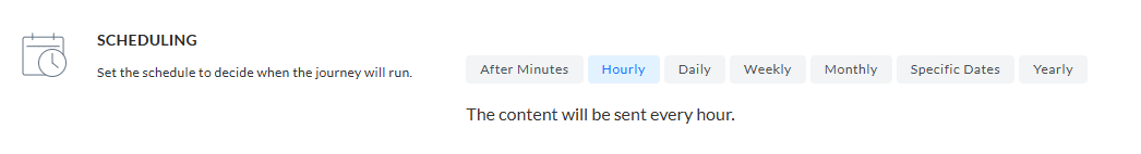 Note: When no start date is set for the activation of the journey, activating it will cause the content to be sent from the moment it's activated, with the scheduled time (hourly, daily, weekly, monthly, custom) still taken into account.
