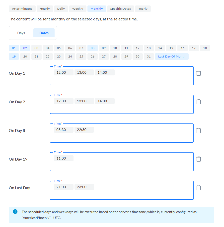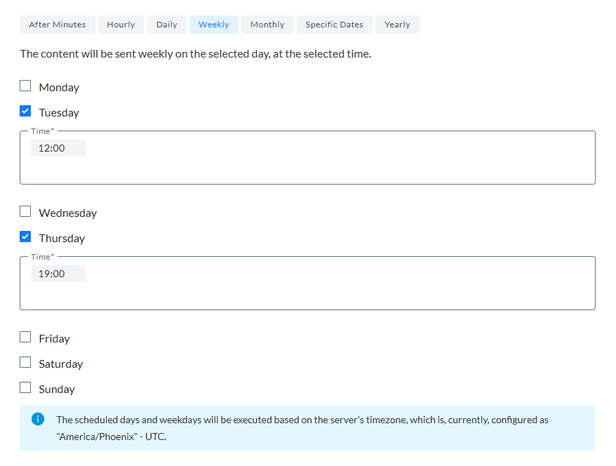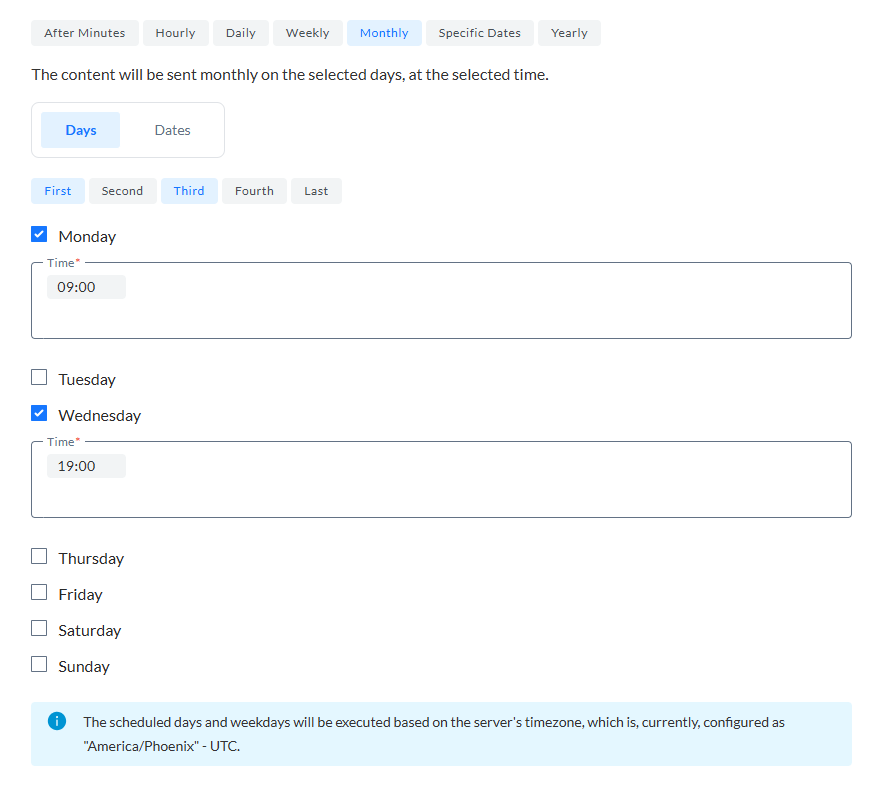 Note: The scheduled days and weekdays will be executed based on the server's time zone.