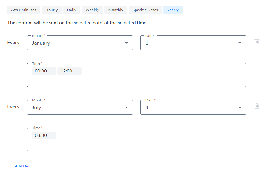 Specific dates — The journey is executed on specific dates and times. Different times can be selected for the different dates. Use the Add date option to add additional dates to the scheduling.