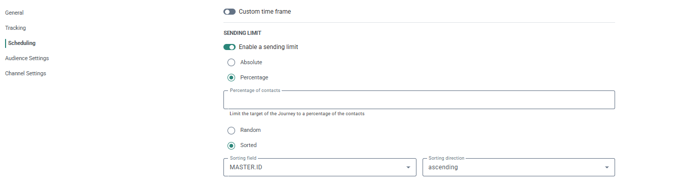 - Percentage — Target only a percentage of the contacts, ex. a sample of 10% of the target. These contacts can be selected in 2 ways: random or based on a sorting order.
