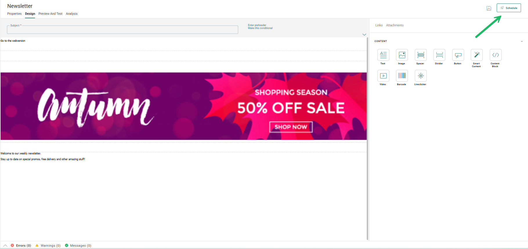The Design window contains the email header, design panel on which components can be dropped and some icons that allow a series of actions.