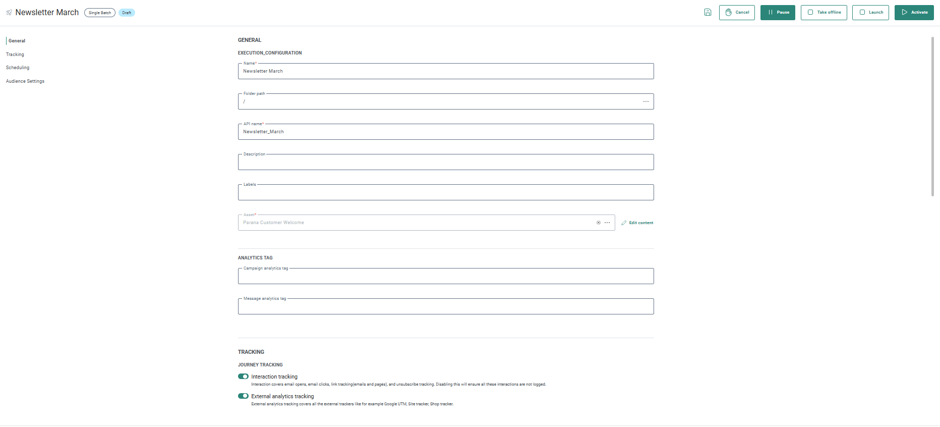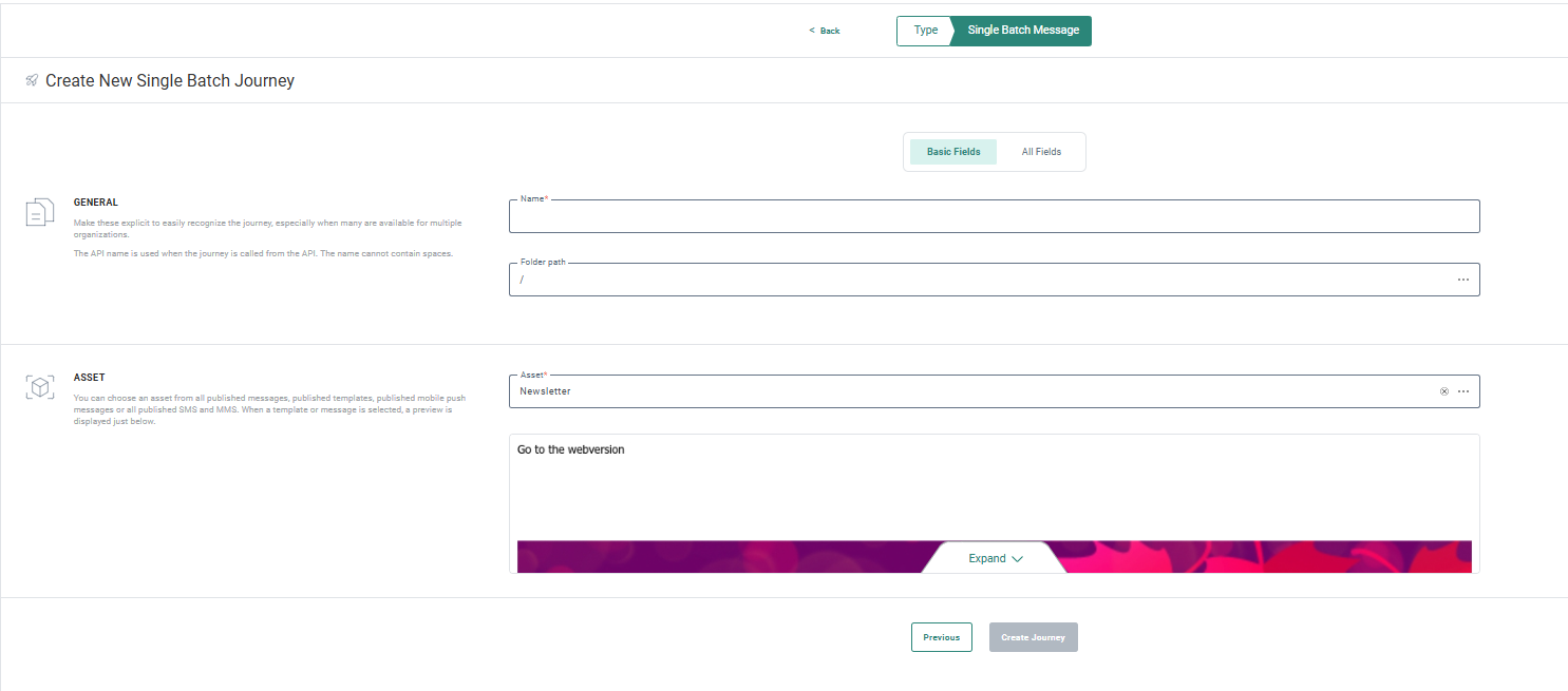 - From the template itself, by clicking the Single Batch Journey button. You are first taken through the first steps of creating a journey, filling out name and tags. A preview of the template is available.
