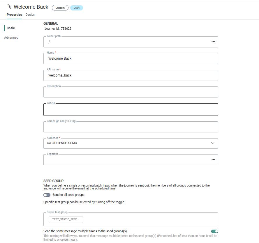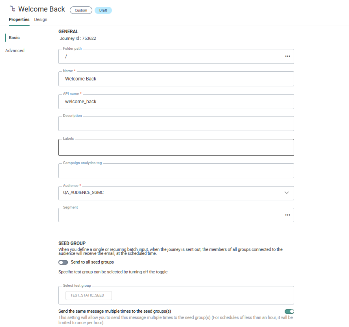 - Send the same message multiple times to the Seed Groups — When the Custom Journey is a Recurring Batch Journey, it is possible to indicate if messages should be sent multiple times to the contacts in the Seed Group. If activated, contacts in the Seed Group will receive a message at every execution of the journey. For schedules less than an hour, it will be limited to one message an hour.