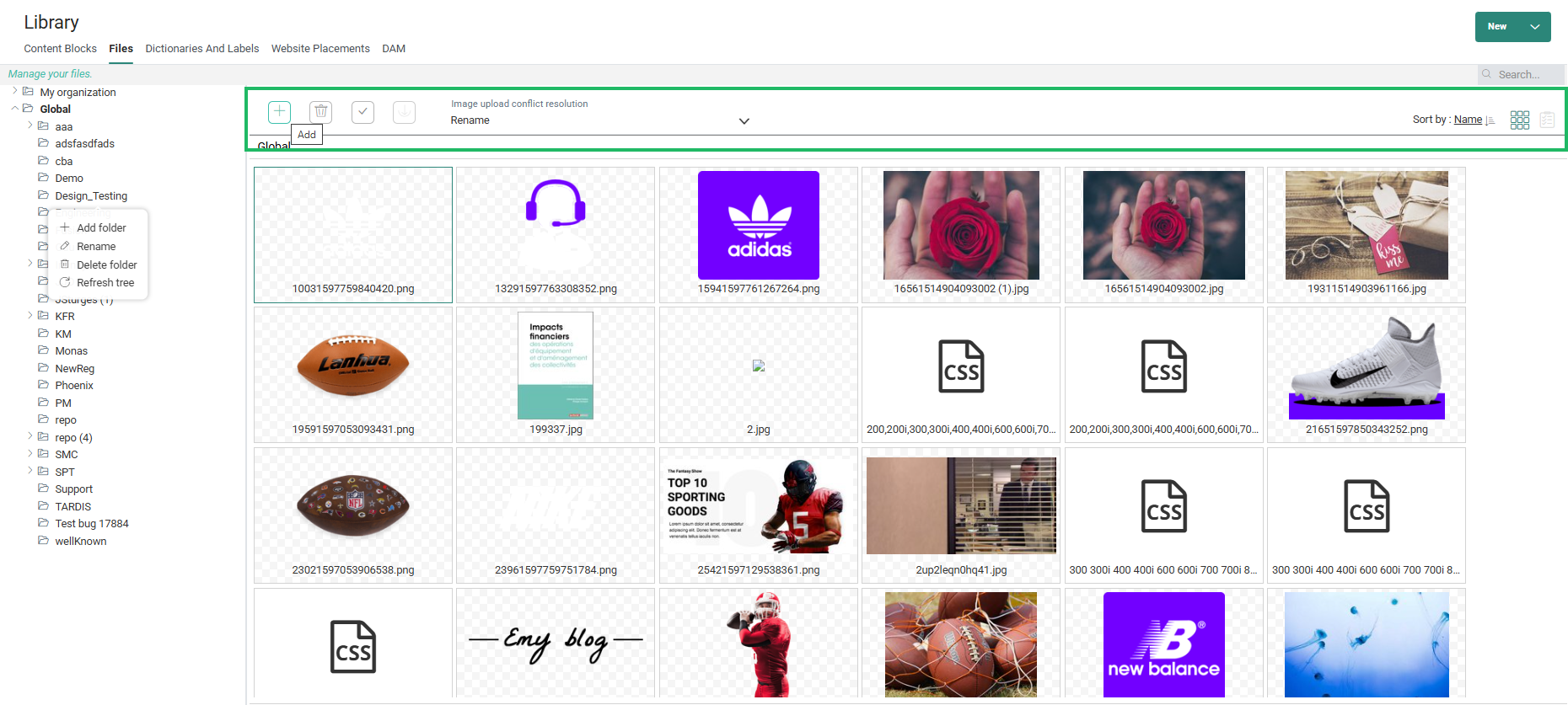 Note: It is advised not to change the folder structure, the file name or folder name for files that are already used in content. If any changes are made to existing files, you need to update all content that uses that file.