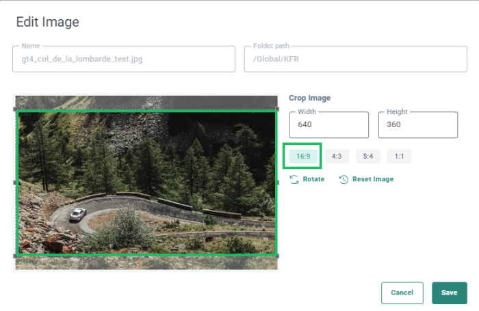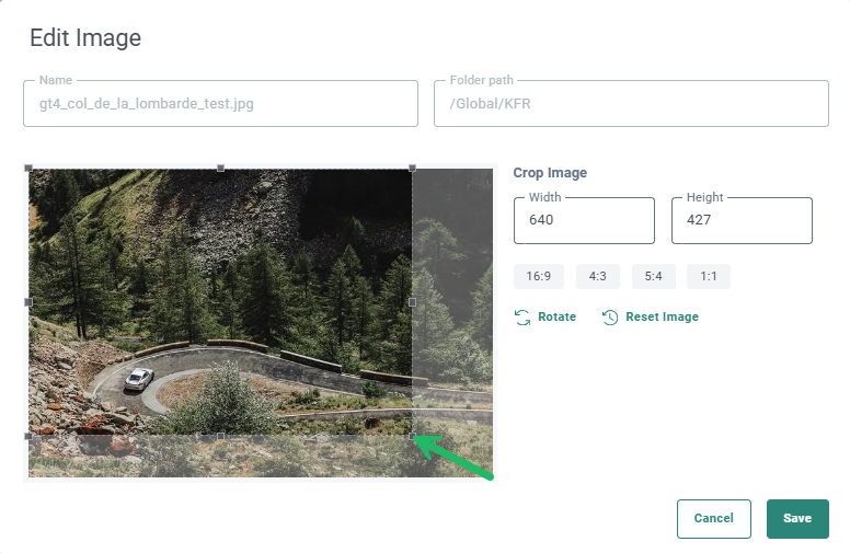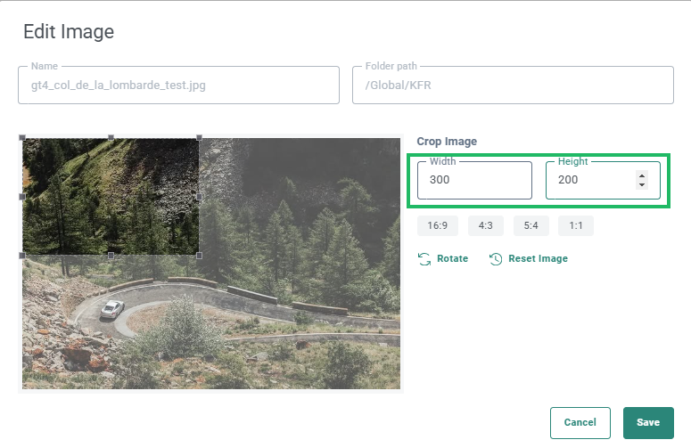A dialog is displayed where you can define the cropped image dimensions and select the specific area of the image you want to keep. There are multiple ways in which this can be achieved: