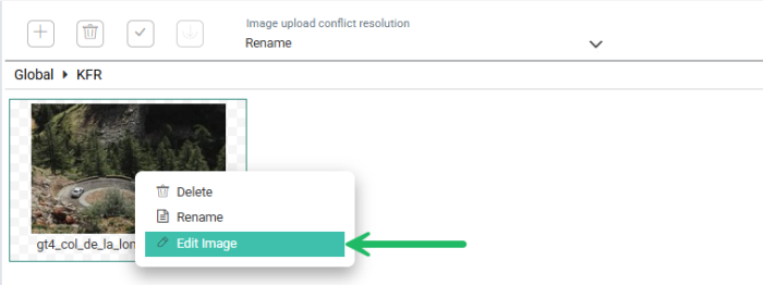 To crop an image directly in the Library, right click the image in the files overview and select Edit image from the pop-up menu.