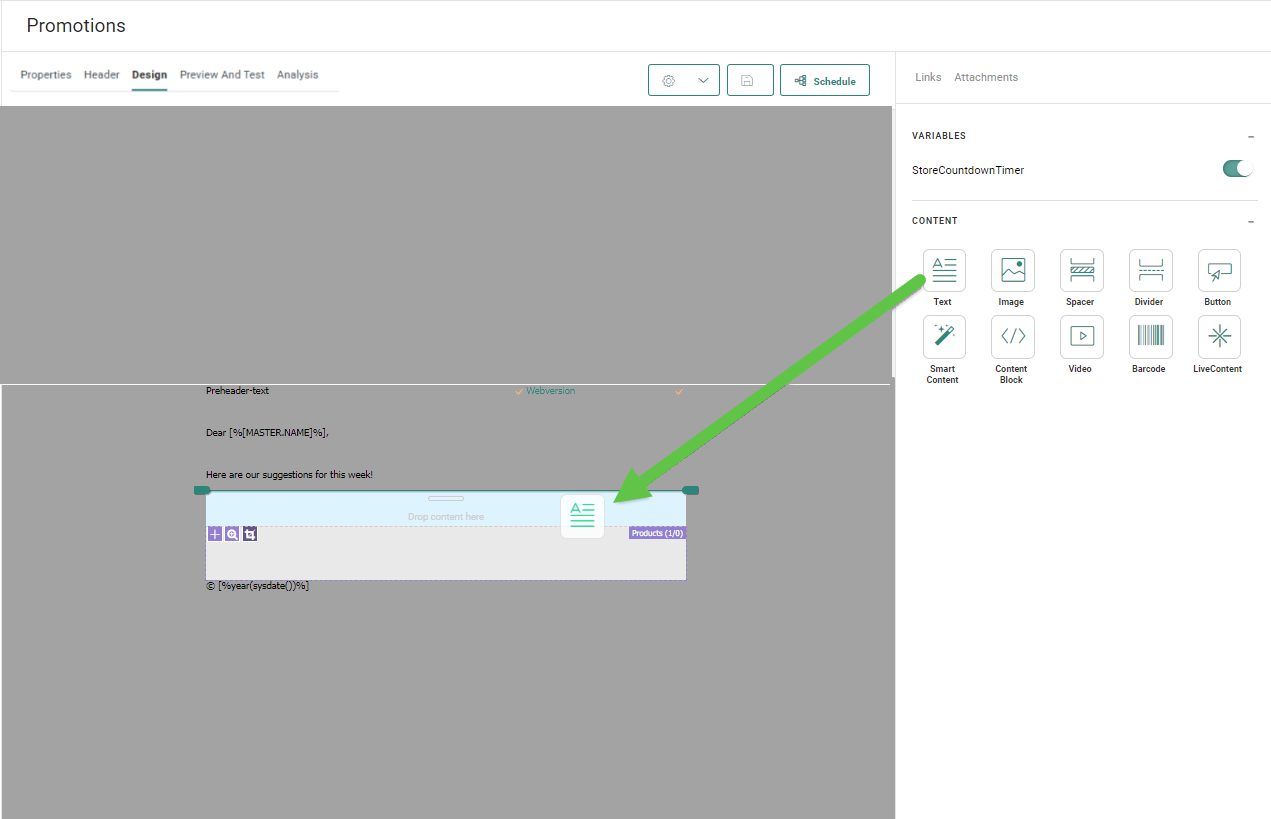 When a journey is created from a template with content placeholder in it, the user can add additional components to the design in that placeholder by simple drag and drop from the components panel on the right. A placeholder in a message looks like this: