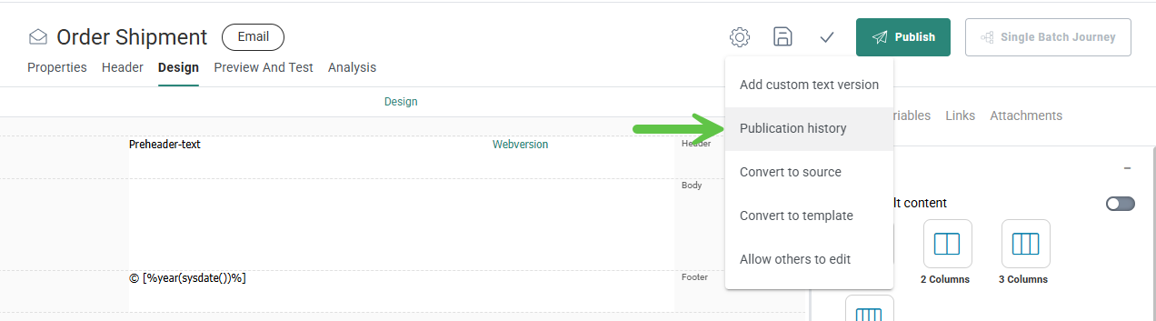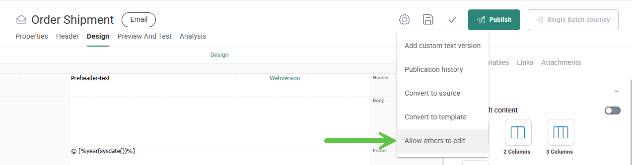 - Design — In Edit mode you can add layout and content components, define the email header, set constraints
