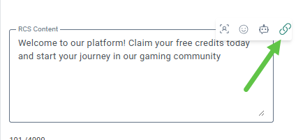 2) Click on the link icon that appears while typing in the RCS content field. The link is then added to the RCS content at the location of your mouse cursor. By default the most recently configured link is added to the message.