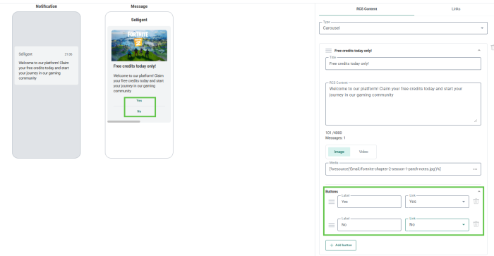 Once the buttons have been designed, they are visible in the message preview, one below the other