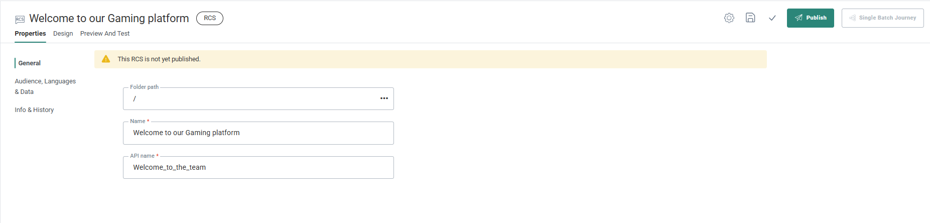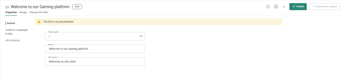 - API Name — Give an API Name to this RCS. The name cannot contain spaces. The API name is used when the message is called from the API.