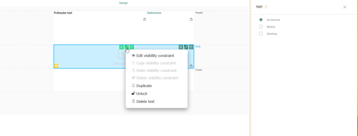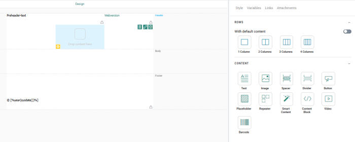 Header — Displayed at the top of the message. By default, the header contains one row with two columns with text components already placed in them: a preheader text and a webversion link You can add additional elements to the header and remove the default elements if required.
