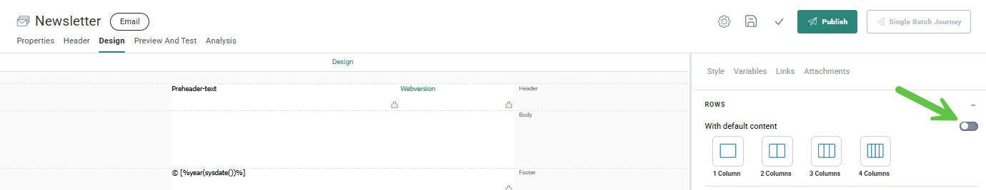 Body — Contains the actual content of the email. The body is empty by default. You can first add Row components and then add Content components to them, or you can add content rows including default content directly to the body. You need to click the toggle With default content in order to see this option.