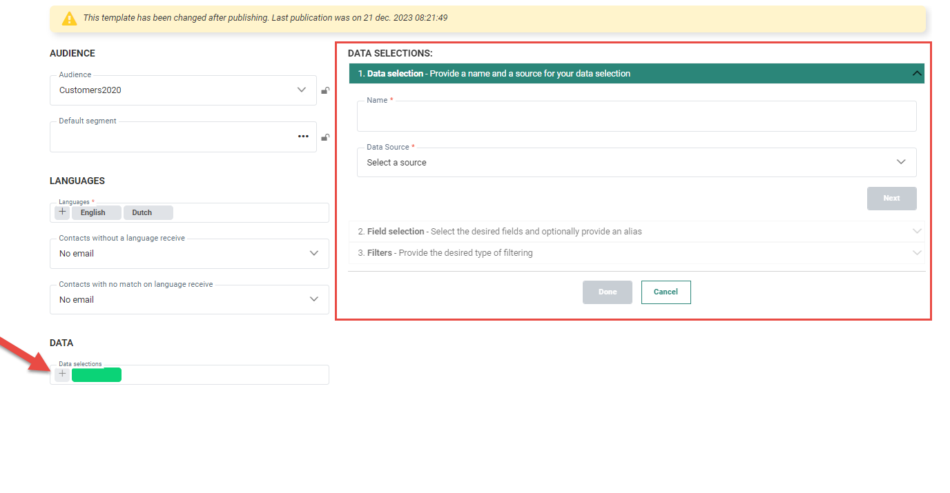 2. In the properties of the message, go to Audience, Languages & Data and add a new data selection. (Verify that the Custom Events Lists is correctly selected as well. This is already filled out when defined during the creation of the message.)