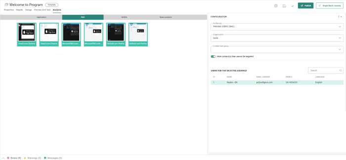 - There is a preview of the message on the different email clients. A tab is provided per type of device (application, tablet or mobile)