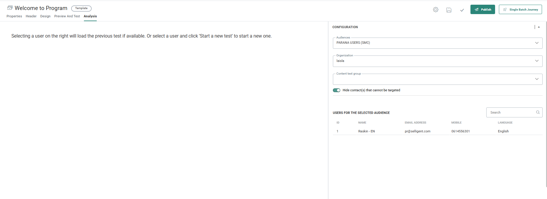 Next, select the contact for whom the test must be performed. Every contact has a language and the test is performed in the contact's language.