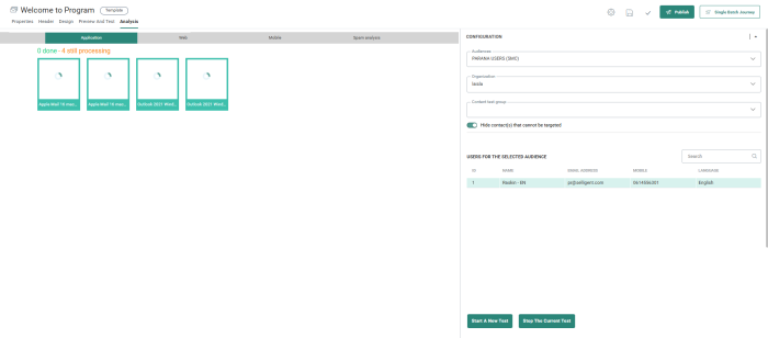 While the analysis is running, the top bar indicates how many were completed, how many are still processing and if mail clients failed the test.