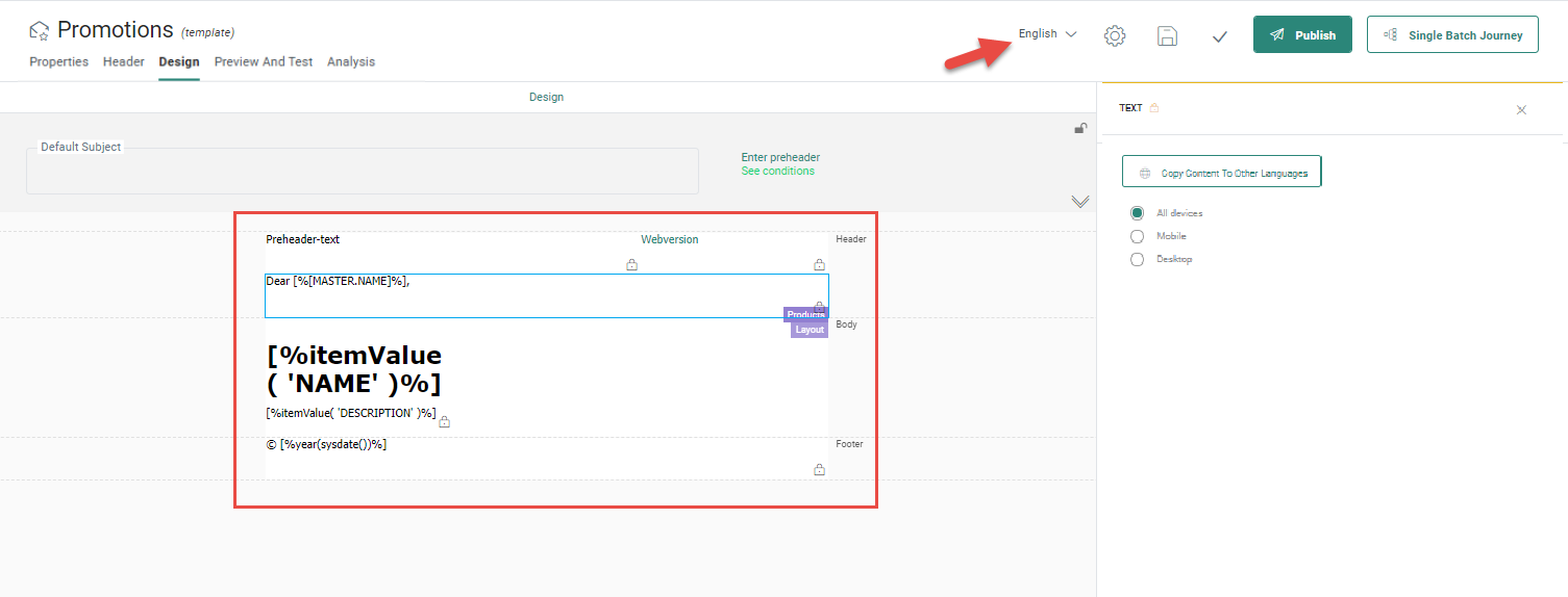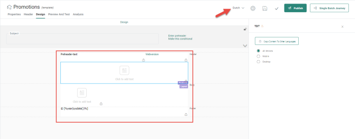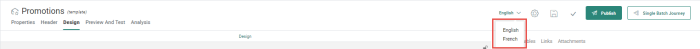 Note: The list of languages is defined in the properties of the message. If a language is missing here you can still add it to the message properties as long as the language exists on Organization level.