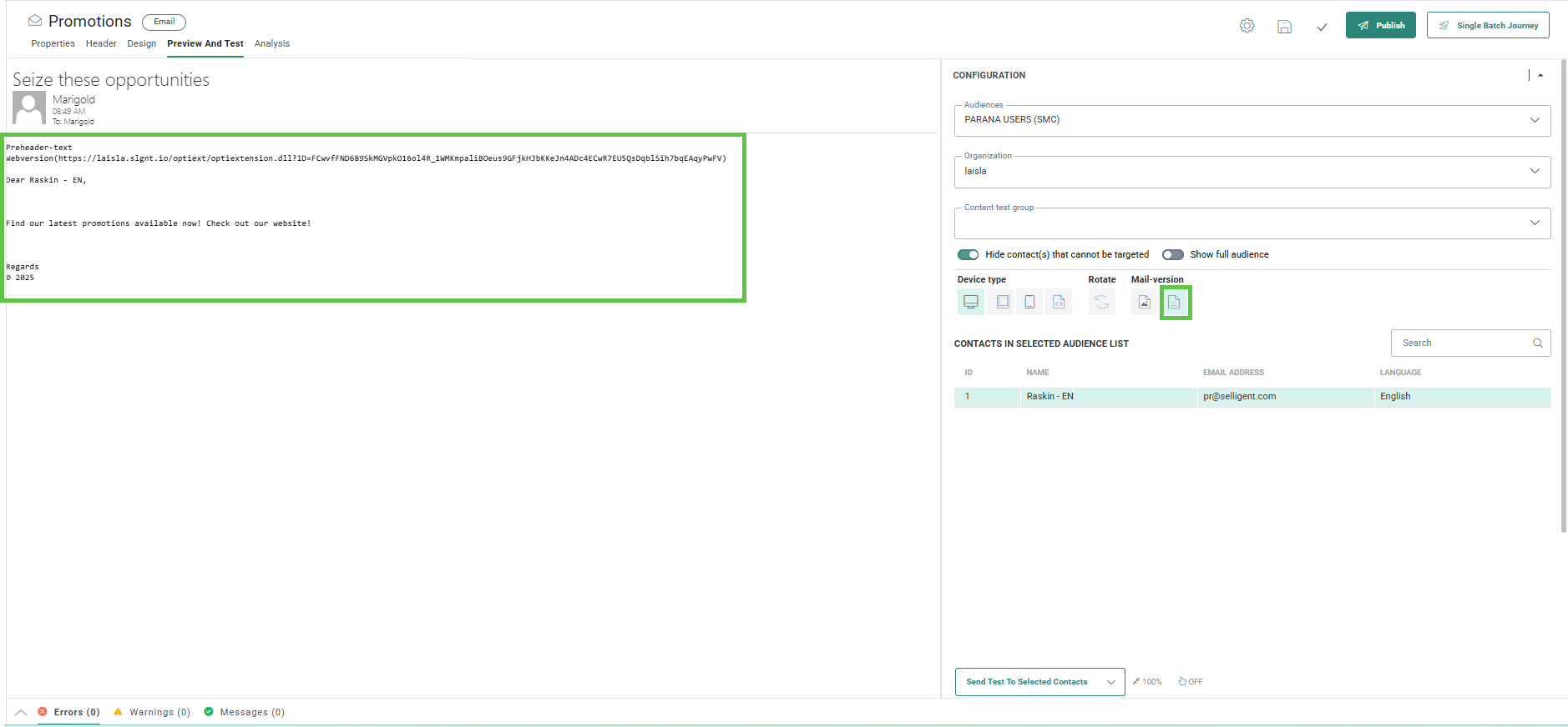 An audience and testuser can be selected. Only contacts set as TESTUSER in the audience will be displayed here. The personalization fields and content sections are adapted to the selected contact.