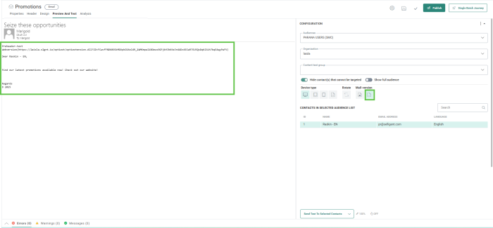 When an email or template is designed (images and text are added, personalization fields, links, etc) it is possible to perform a check on how the message is perceived, on a desktop, tablet or mobile.