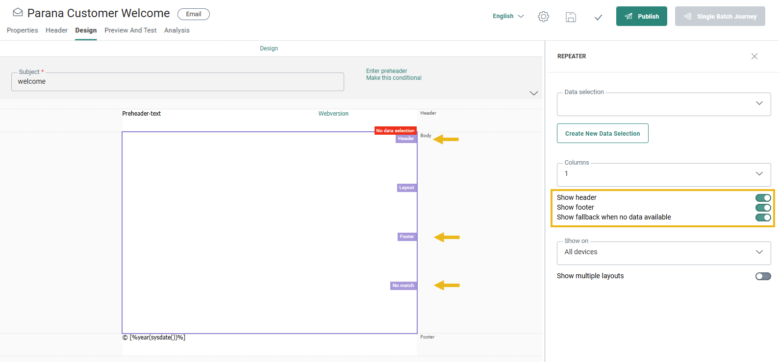 When a repeater is added to the design, it has a predefined layout with Header, Layout, Footer and No match section. Only the layout section is mandatory and is visible by default. The other sections are optional and can be hidden.