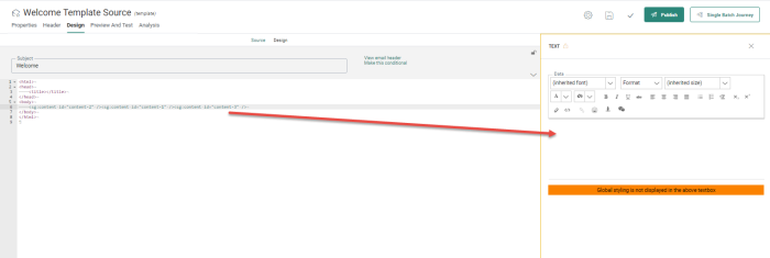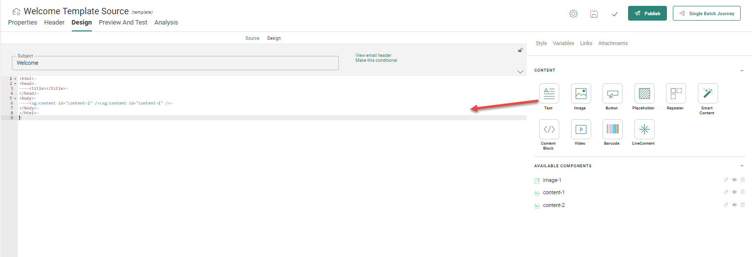 When Content Components are added to the source code of the template or email, automatically an <SG> tag is added to the source. These <SG> tags are specific to Selligent. Clicking such a tag in the source allows editing the content directly in the properties panel on the right.