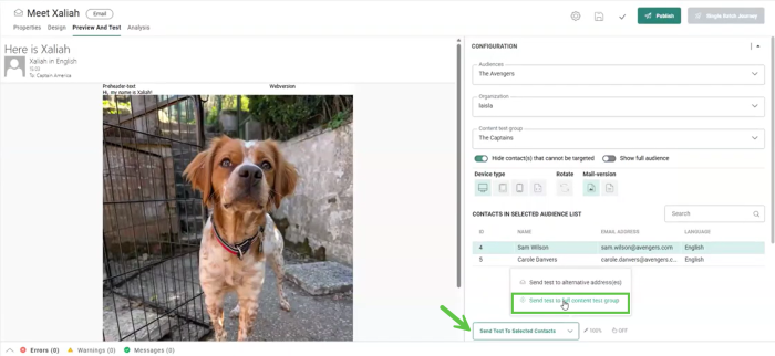 1. In the Preview & Test section of your message, go to the email properties on the right and, under Configuration, select first the Audience List. You then have access to all Test Groups linked to that Audience. Select one from the List.