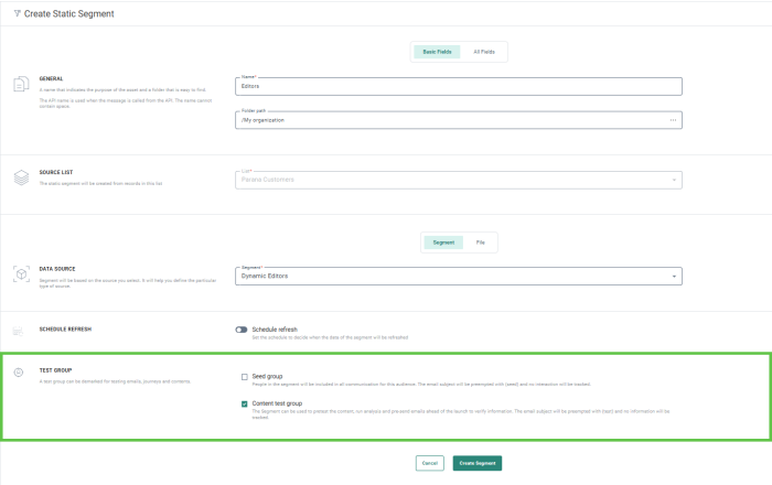 2. The Segment creation wizard is displayed. For more details on the different options for a static segment, check out this topic. The options specific to the Test Group are listed below: