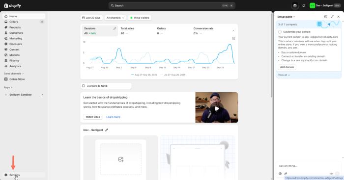 - Log in at https://shopify.com/admin to access your Shopify Admin account and go to Settings.