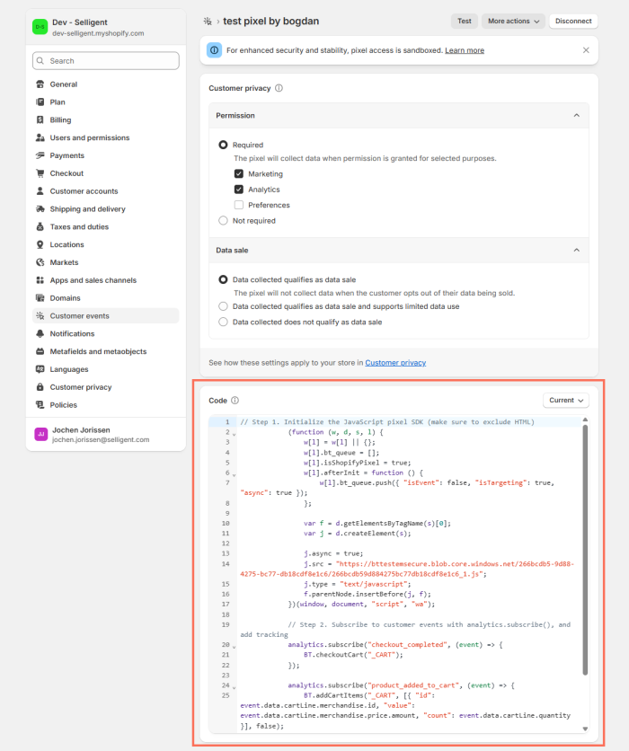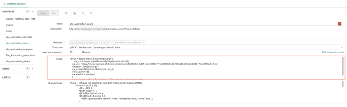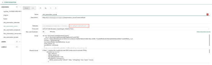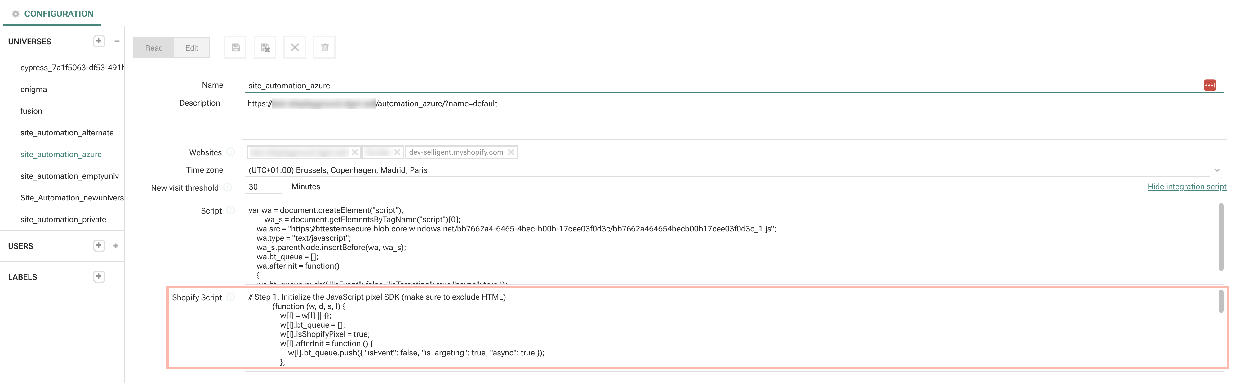 Therefore, a Shopify script is introduced on the Site Universe configuration screen, that allows you to track carts and implement tags through Shopify pixels and customer events.