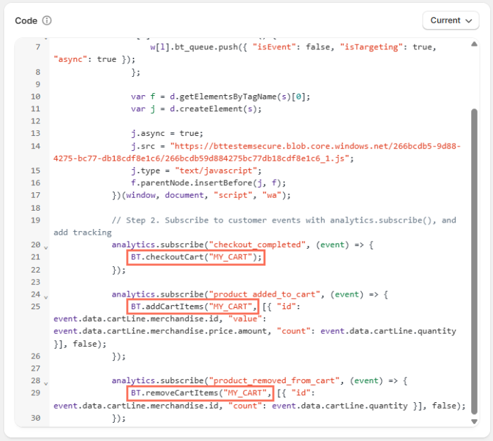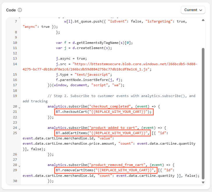 - Then adapt the values mentioned in the Shopify script as "{{REPLACE_WITH_YOUR_CART}}", with the actual Site Cart public name.