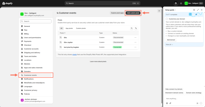 - Go to Customer events in the left-hand navigation and Add a custom pixel.