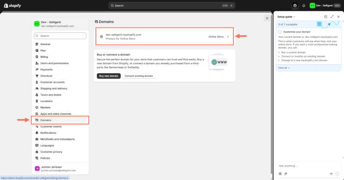 - Click on Domains in the left-hand navigation and make sure your online store is added as a connected domain (e.g. click on Connect existing domain, or buy a new domain if needed).