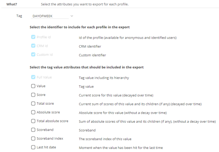 What? Select the attributes you want to export for this profile
