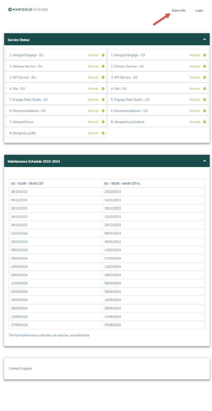 The status page provides you with regular updates regarding the status of the Engage platform in the event of a major system outage in your region.