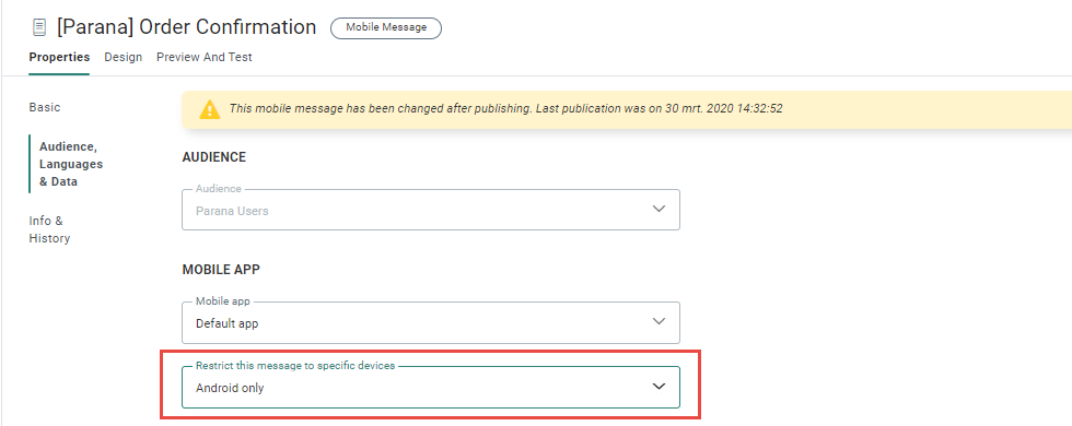 When a device type filter is defined in the properties of the message, only the corresponding Mobile OS type is enabled on the Preview tab.