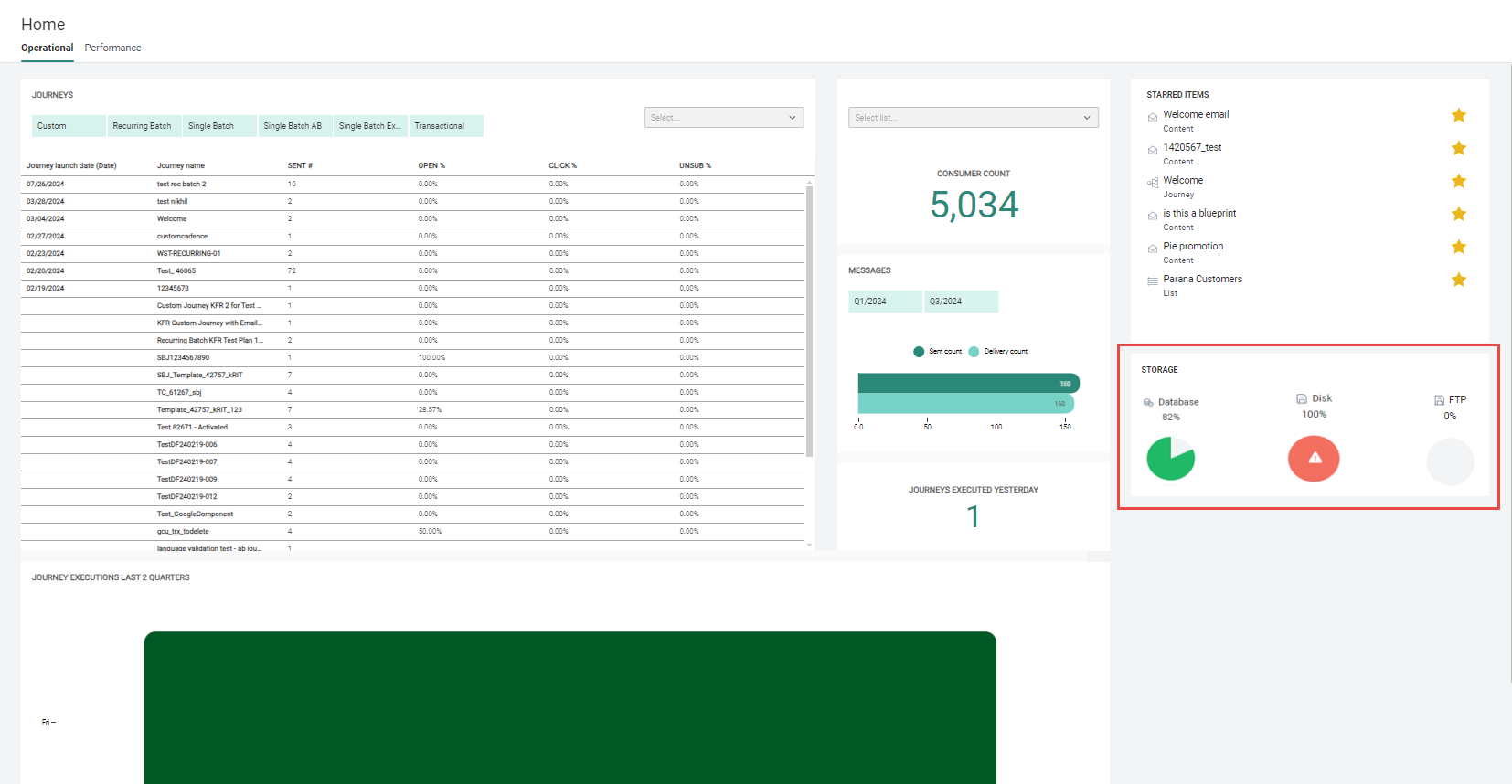 The Engage Home page with the Operational tab, provides valuable information on how marketing campaigns are doing, as well as insights on messages, contacts and journeys.