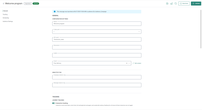 When you open the Single Batch Journey properties, you’ll see several entries on the left that organize the journey details in a clear, structured way. You can click any entry to jump to a specific section, or simply scroll through the screen to browse them all.