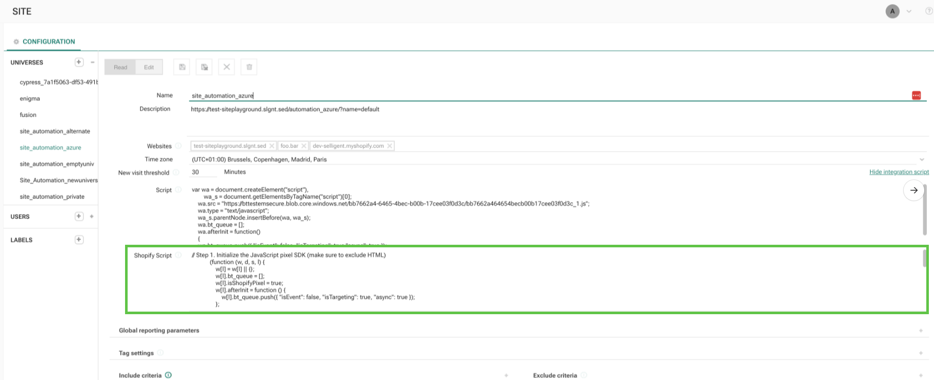 An additional integration script is now available when configuring a universe. This script can be copied into Shopify when creating a new Shopify Pixel and makes it possible to track when items are added to or removed from a cart, as well as when a checkout has been completed.