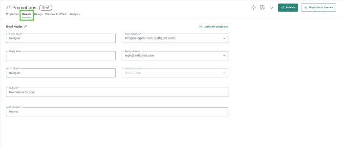 A dedicated tab is now available for the email header with all email header fields displayed at all times (previously these fields were collapsed on the Design tab of the message):