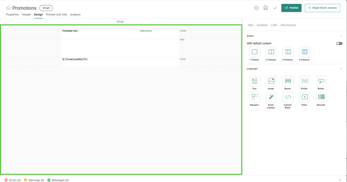 The email header of email and template messages has now a dedicated tab in the message design canvas. On one hand this helps identifying the email header as an important step in the design of a message, while at the same time maximizing the design panel for the message content itself