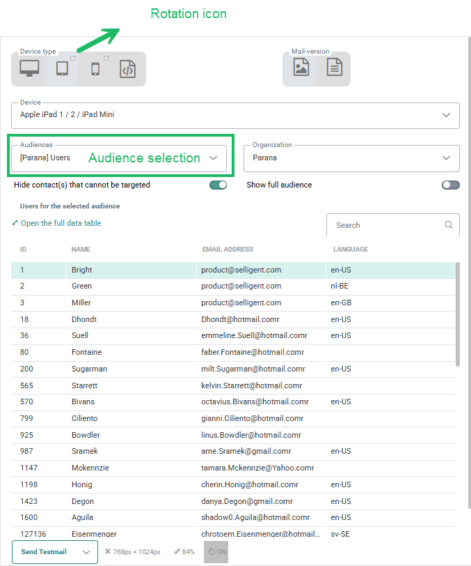 The selection of the Audience List and Organization as well as the toggles to filter the contacts in this audience, are shown below the Device icons. This information is shown at all times, taking up valuable space that could be used to list the contacts